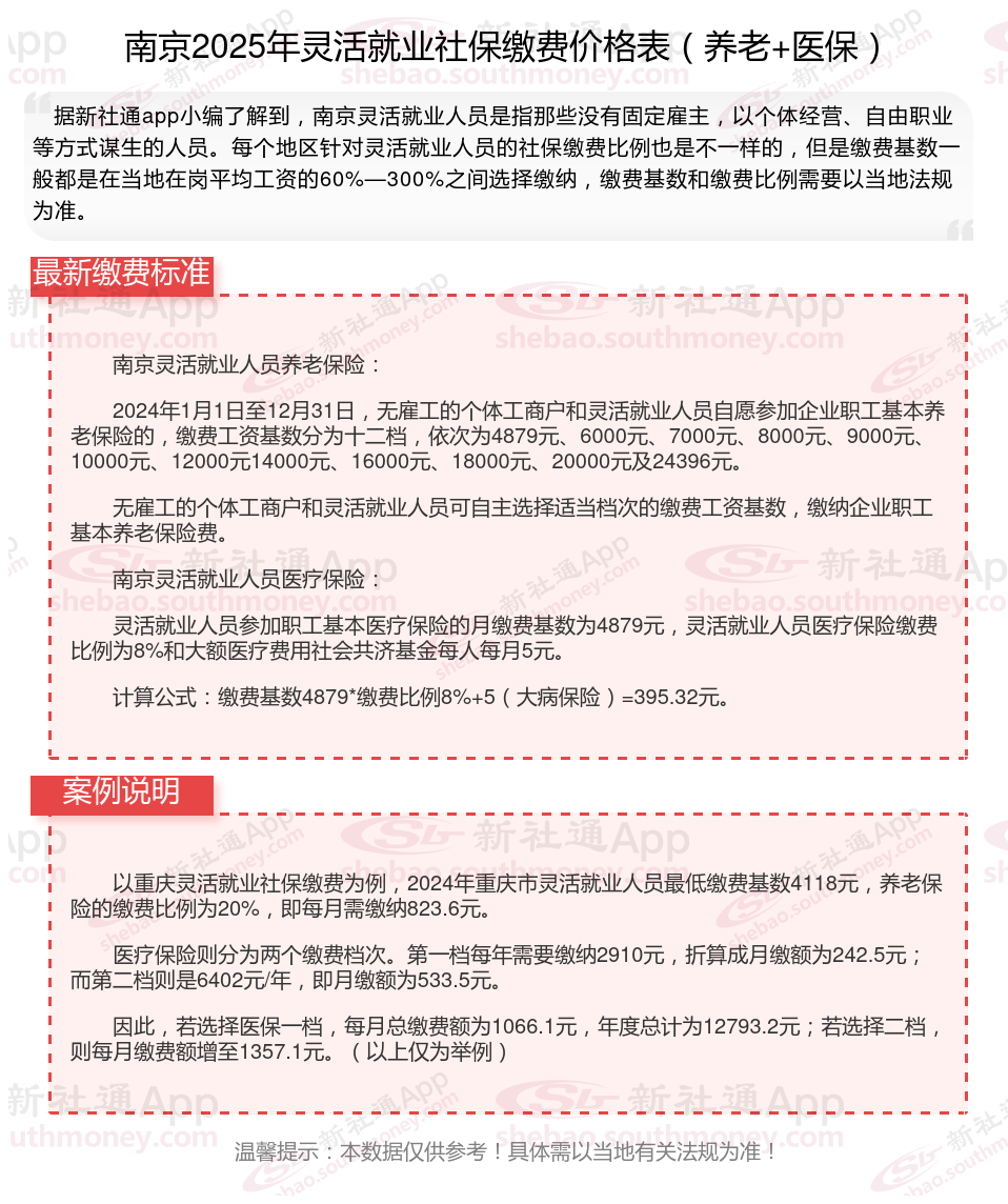 灵活就业者缴纳社会保险,一般需要交多少钱一个月?根据新社通app-社保缴费查询工具提供的2025社保缴费标准详情数据: