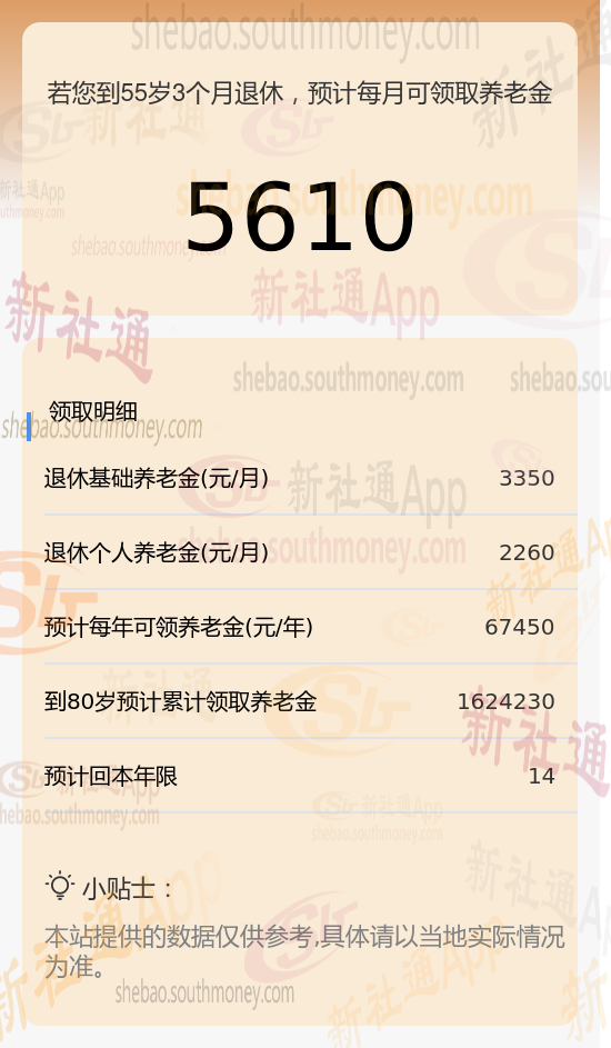每月可领养老金=基础养老金+个人养老金≈3350+2260≈5610元