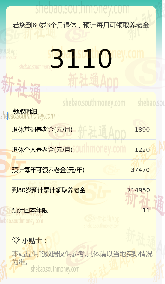 每月可领养老金总额:将基础养老金与个人养老金相加,每月可领取的养老金总额约为3110元(1890元+1220元)。
