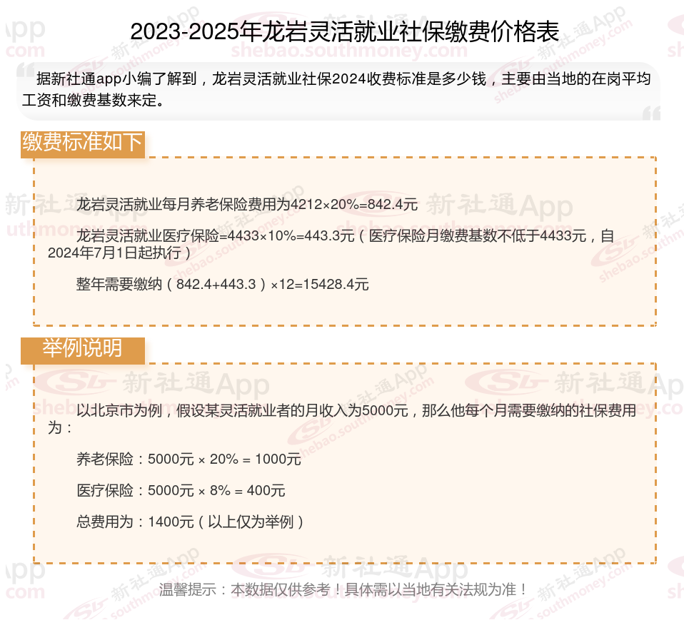 据新社通app数据显示,龙岩灵活就业养老保险的缴费基数为:4212元。灵活就业人员参保缴费的比例为个人20%。