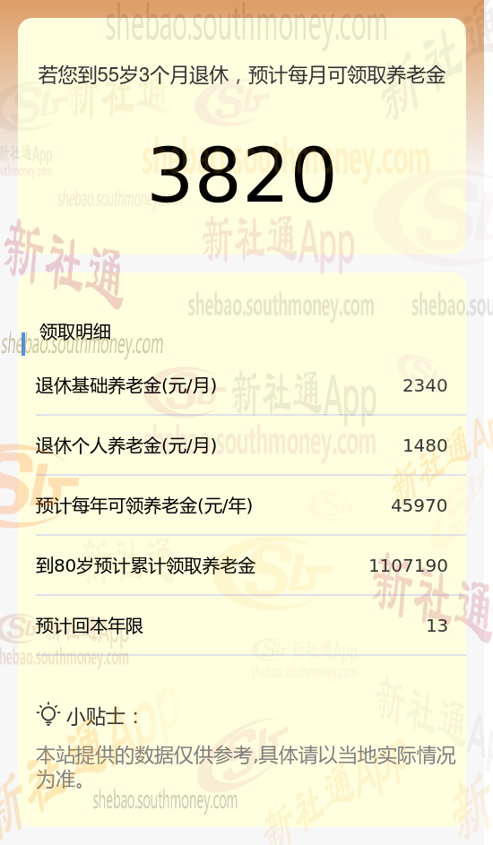 每月可领养老金总额:将基础养老金与个人养老金相加,每月可领取的养老金总额约为3820元(2340元+1480元)。