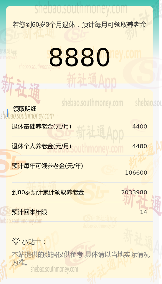每月可领养老金总额:将基础养老金与个人养老金相加,每月可领取的养老金总额约为8880元(4400元+4480元)。