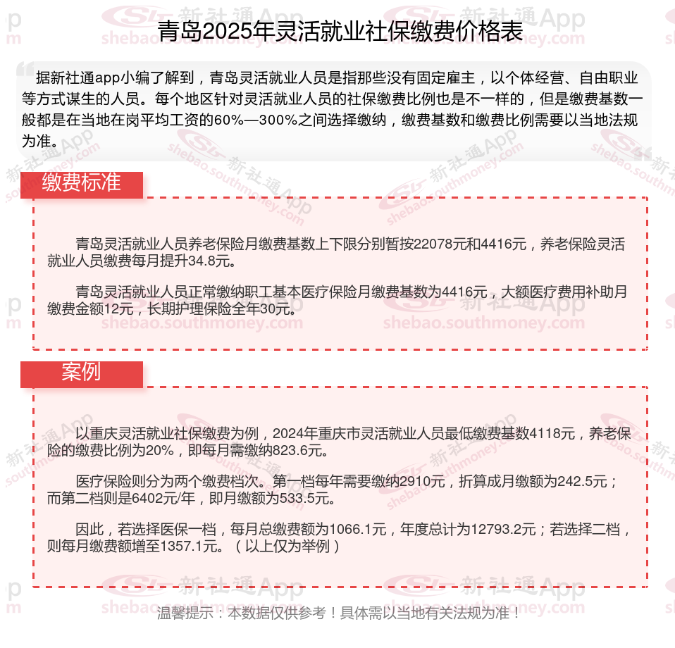 据新社通app数据显示,青岛灵活就业人员养老缴费基数2024-2025年最新标准如下: