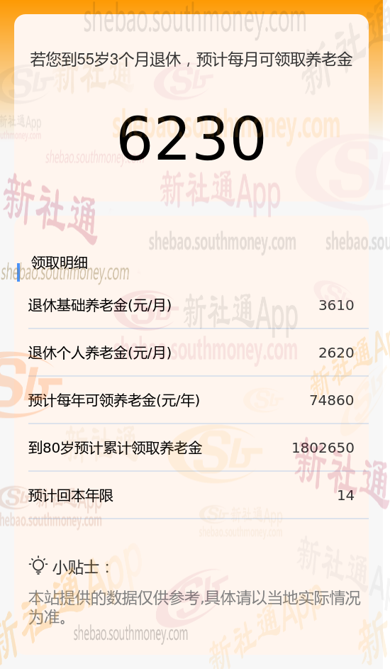 基于这些关键信息,我们使用新社通app养老金计算器对他未来的养老金进行了详细估算: