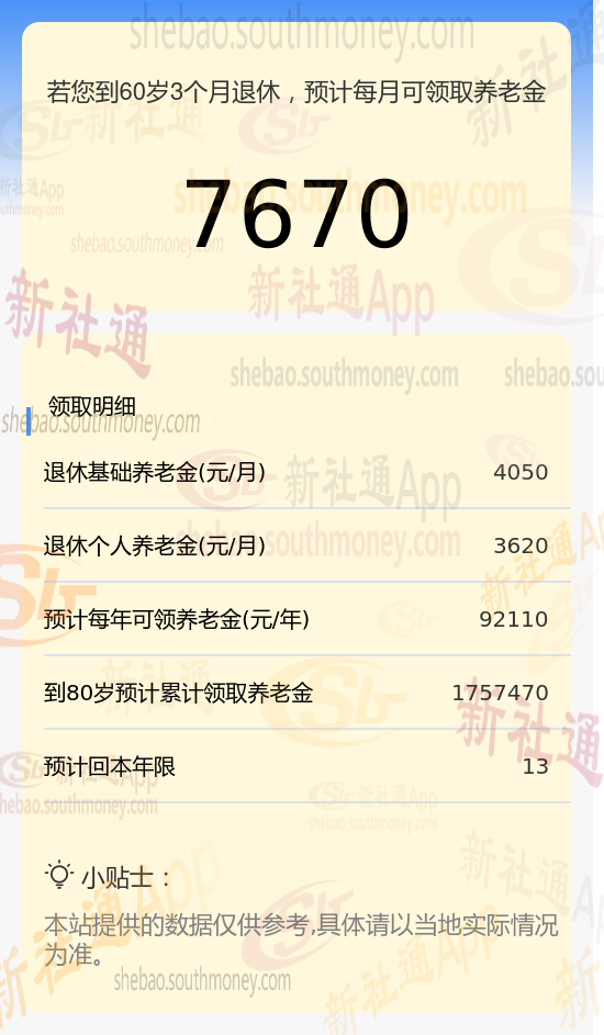 基础养老金=(参保人员退休时当地上年度在岗职工月平均工资+本人指数化月平均缴费工资)÷2×缴费年限×1%通过公式计算出每月大约4050元。