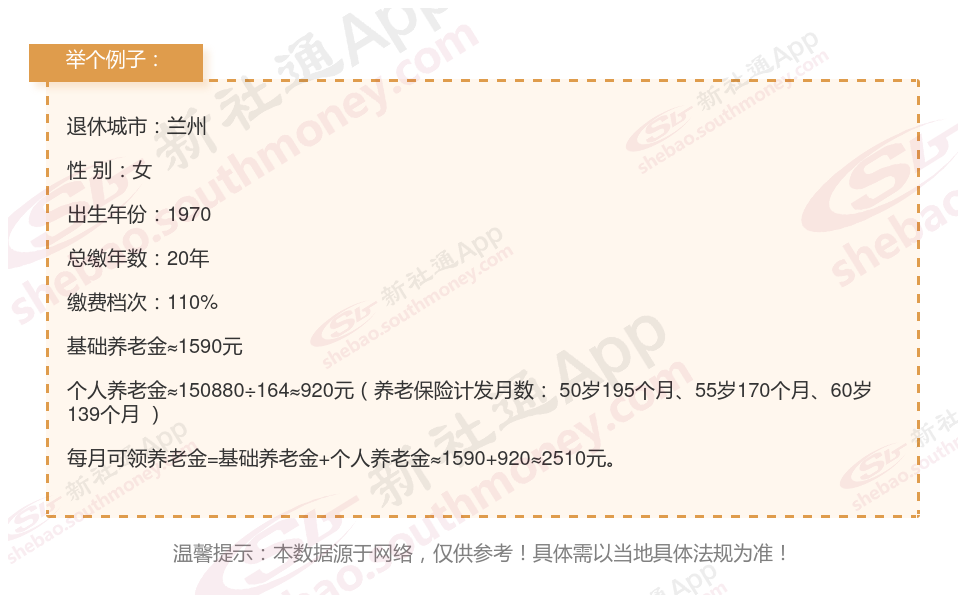 退休城市:兰州,性别:女,出生年份:1970,总缴年数20年,缴费档次:110%,新社通app养老金计算器所得: