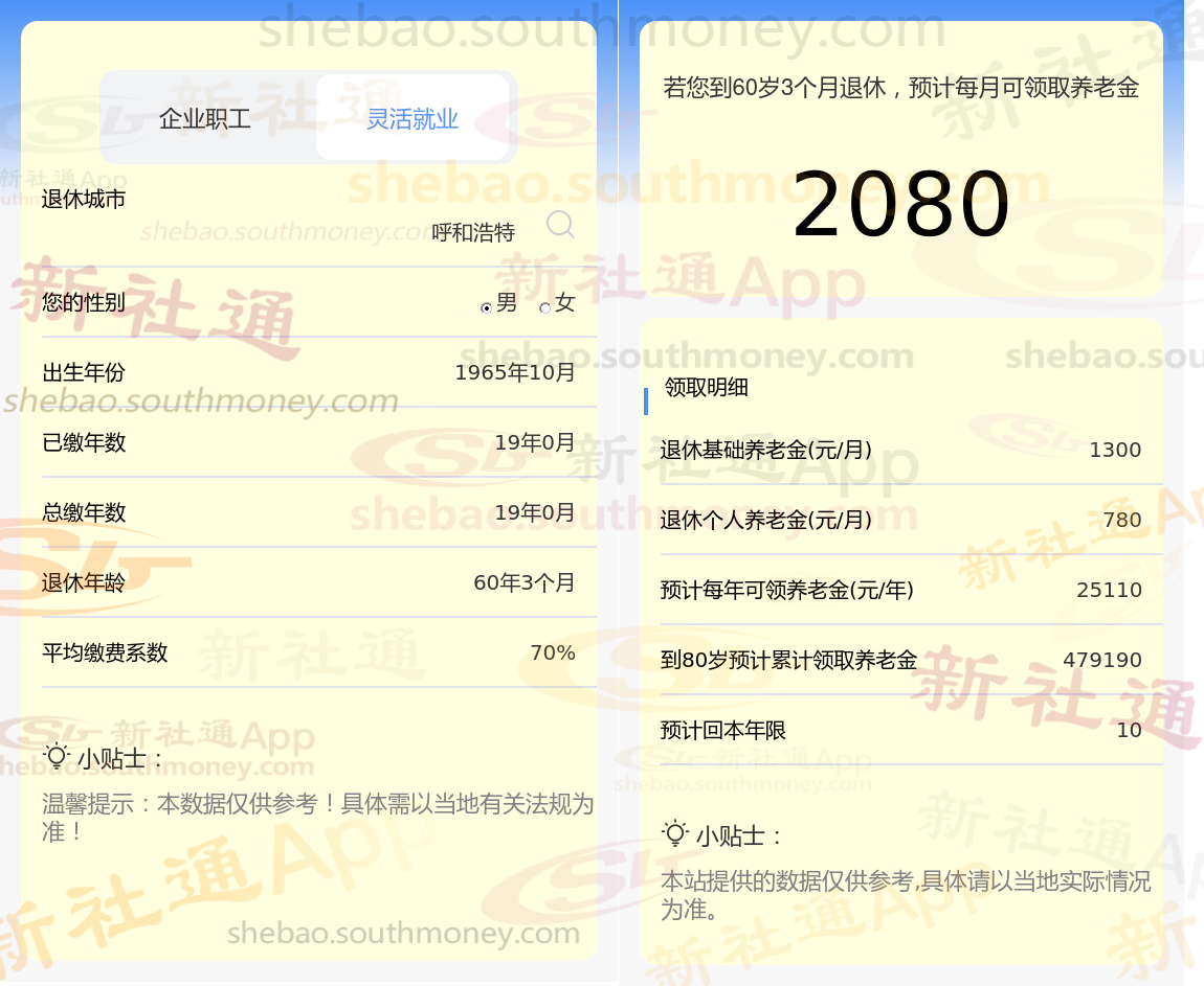网友杨某退休城市在呼和浩特,性别:男,出生年份:1965,总缴年数19年,缴费档次:70%,新社通app养老金计算器所得:
