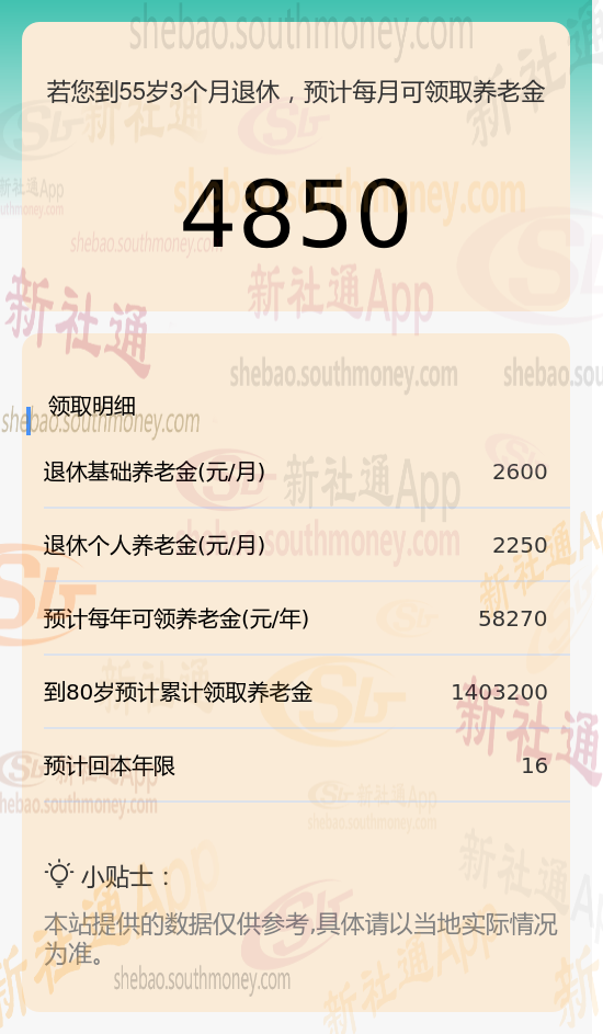 每月可领养老金=基础养老金+个人养老金≈2600+2250≈4850元。