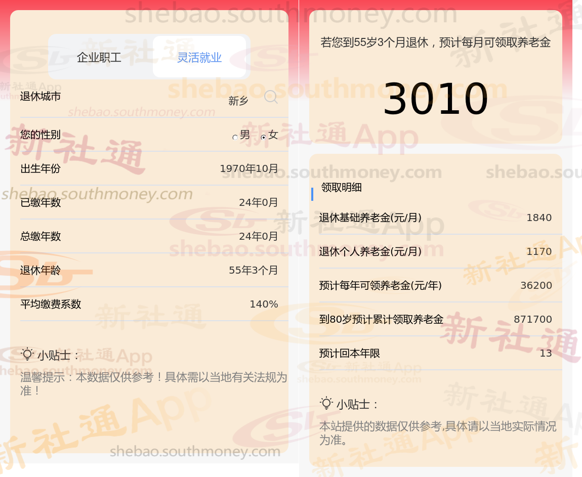 退休城市:新乡,性别:女,出生年份:1970,总缴年数24年,缴费档次:140%,新社通app养老金计算器所得: