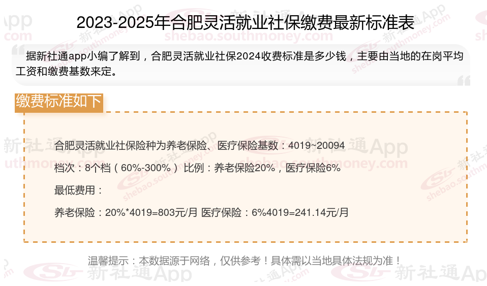 据新社通app数据显示,合肥灵活就业人员养老缴费基数2024-2025年最新标准如下: