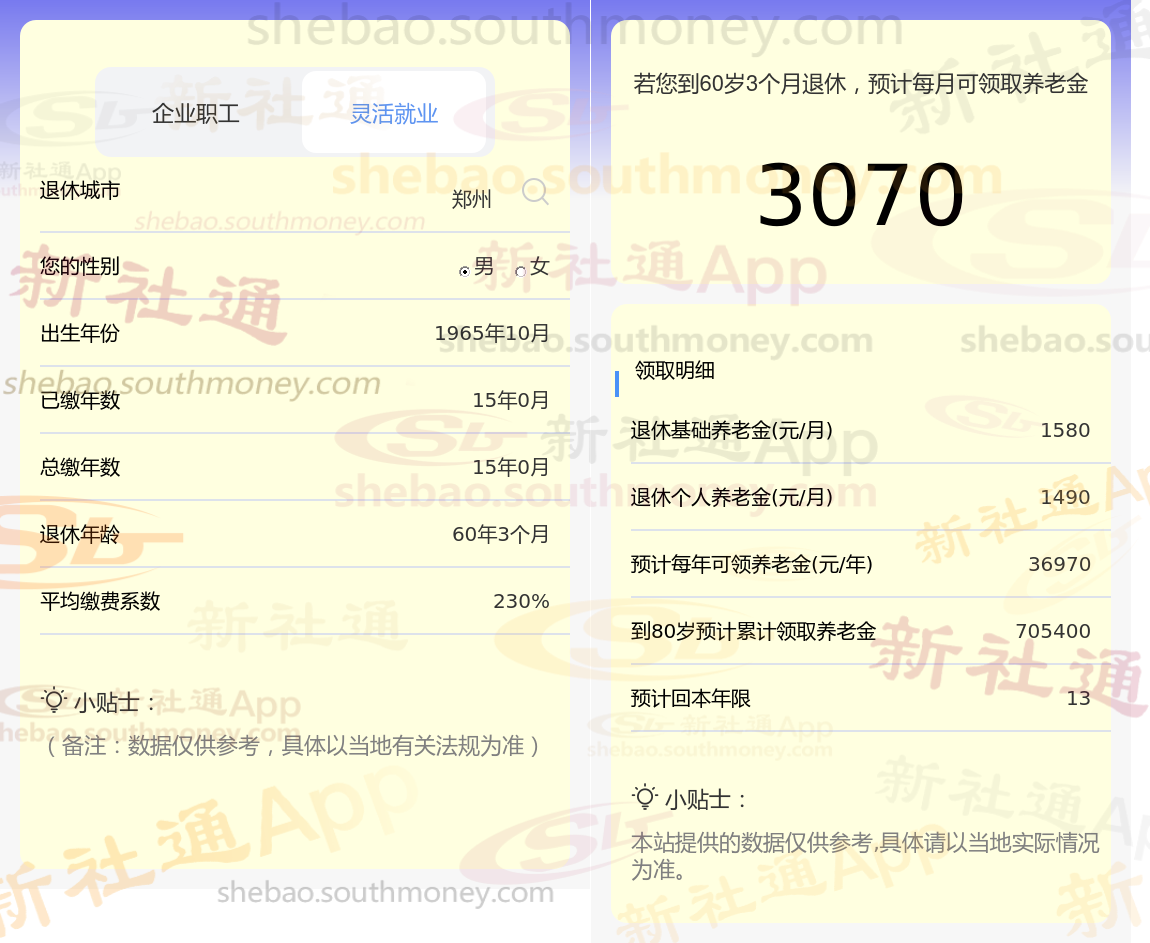 林某,男,1965年出生,现居郑州并已退休。其养老保险缴纳情况如下:总缴费年限为15年,缴费档次达到230%。根据新社通app养老金计算器的估算结果: