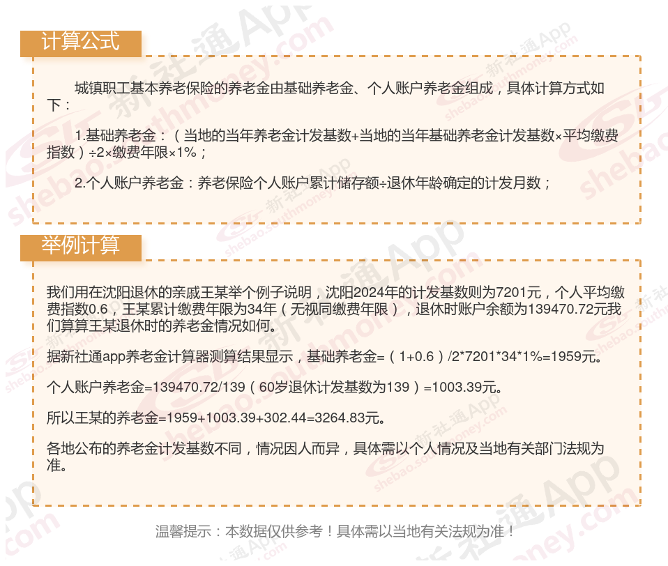 基础养老金:以当地上年度在岗职工月平均工资和本人指数化月平均缴费工资的平均值为基数,缴费每满1年发给1%。计算公式为:基础养老金=(参保人员退休时全区上年度城镇单位在岗职工月平均工资+本人指数化月平均缴费工资)/2×缴费年限×1%。