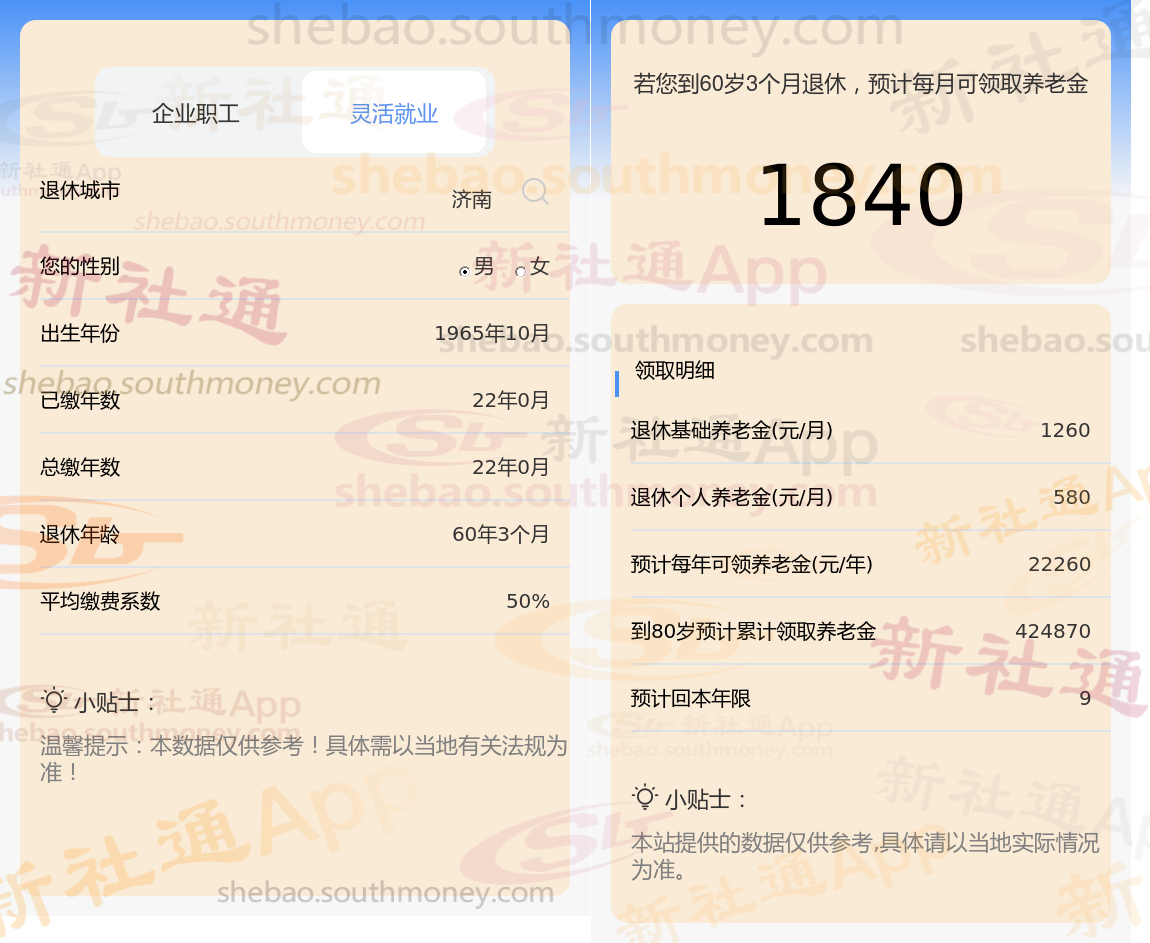 笔友朱某退休城市在济南,性别:男,出生年份:1965,总缴年数22年,缴费档次:50%,新社通app养老金计算器所得: