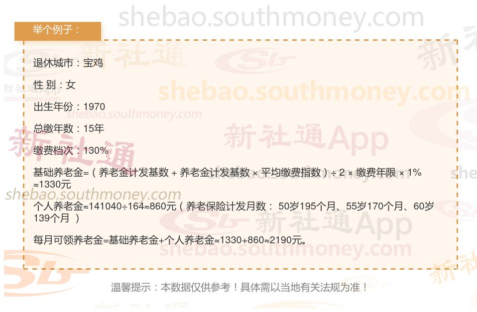 个人基础信息:女性,1970年出生,宝鸡退休人士,拥有15年的缴费年限,缴费档次为130%。