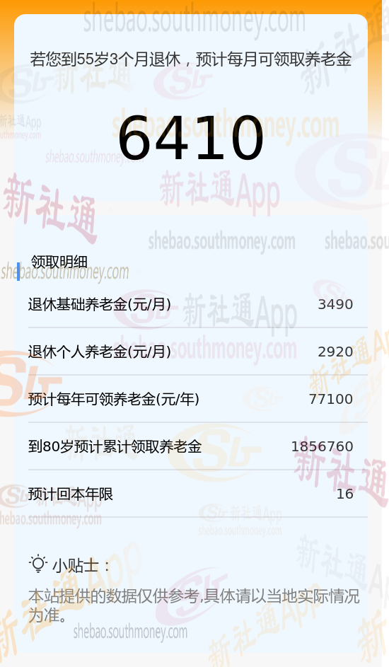 养老金总和:基础养老金+个人养老金=3490元+2920元≈6410元/月。