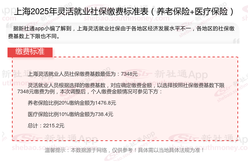 据新社通app数据显示,上海企业灵活就业养老保险的缴费基数为:7384元。
