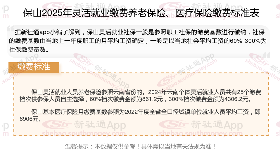据新社通app数据显示,保山灵活就业人员养老保险缴费基数2024-2025年最新标准如下: