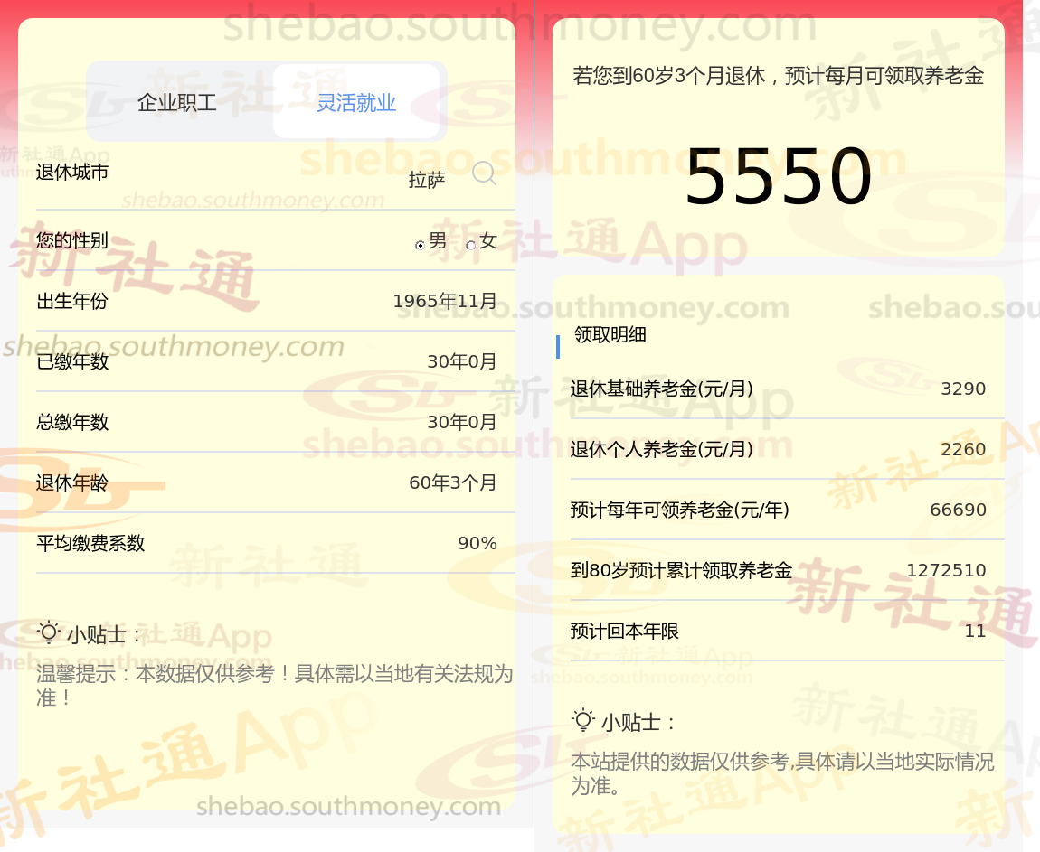 网友沈某退休城市在拉萨,性别:男,出生年份:1965,总缴年数30年,缴费档次:90%,新社通app养老金计算器所得: