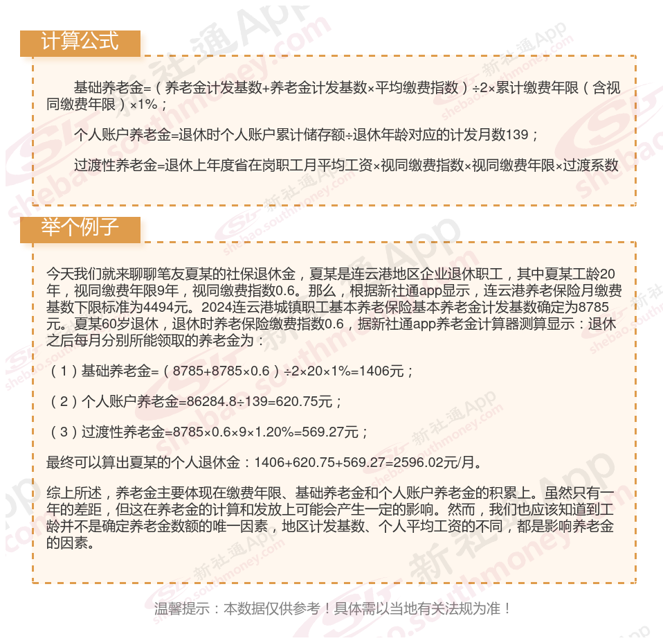 基本养老金=基础养老金+个人账户养老金+过渡性养老金=退休前一年全市职工月平均工资×20%(缴费年限不满15年的按15%)+个人账户本息和÷120+指数化月平均缴费工资×1997年底前缴费年限×1.4%。