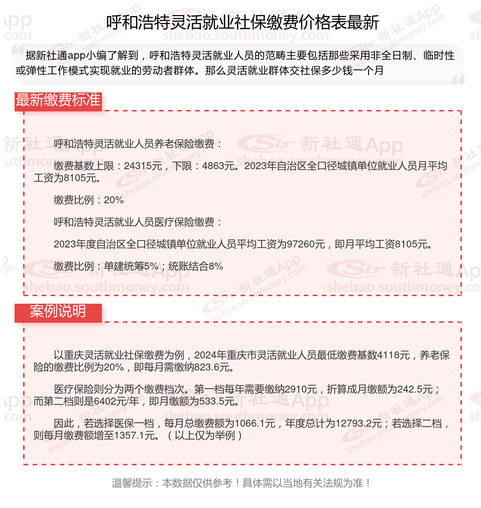 据新社通app数据显示,呼和浩特灵活就业人员养老缴费基数2024-2025年最新标准如下: