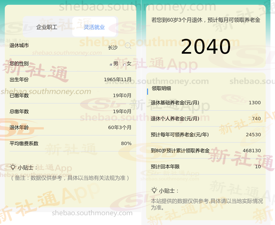 退休城市:长沙,性别:男,出生年份:1965,总缴年数19年,缴费档次:80%,新社通app养老金计算器所得: