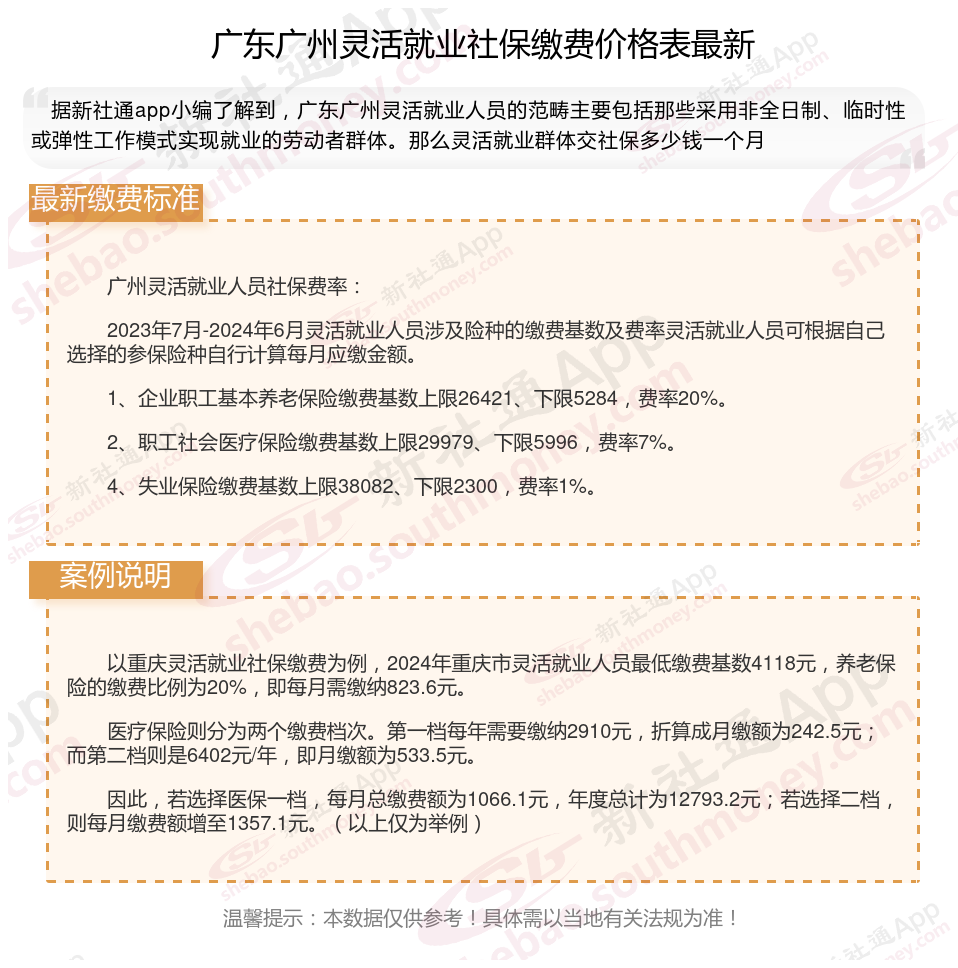 据新社通app数据显示,广东广州灵活就业养老保险缴费基数2024-2025年最新标准如下: