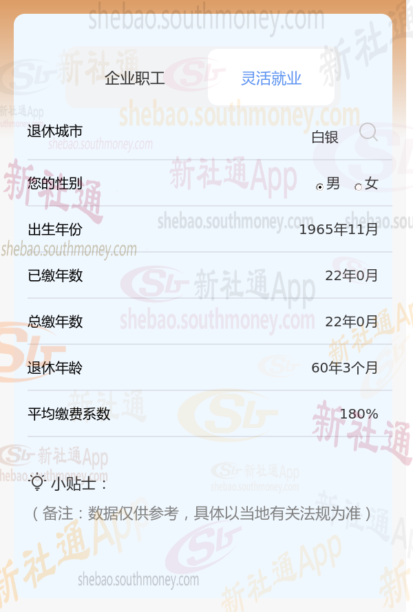 退休城市:甘肃白银,性别:男,出生年份:1965,总缴年数22年,缴费档次:180%为例,新社通app养老金计算器预设工资增长率等参数为3%。在此情境下,其退休后能领取的养老金数额需通过计算器精确得出,但基于上述条件,预计数额会相对较低。为获准确估算,建议孔某使用计算工具按要求输入个人信息进行计算,具体数额依个人情况及当地法规而定。