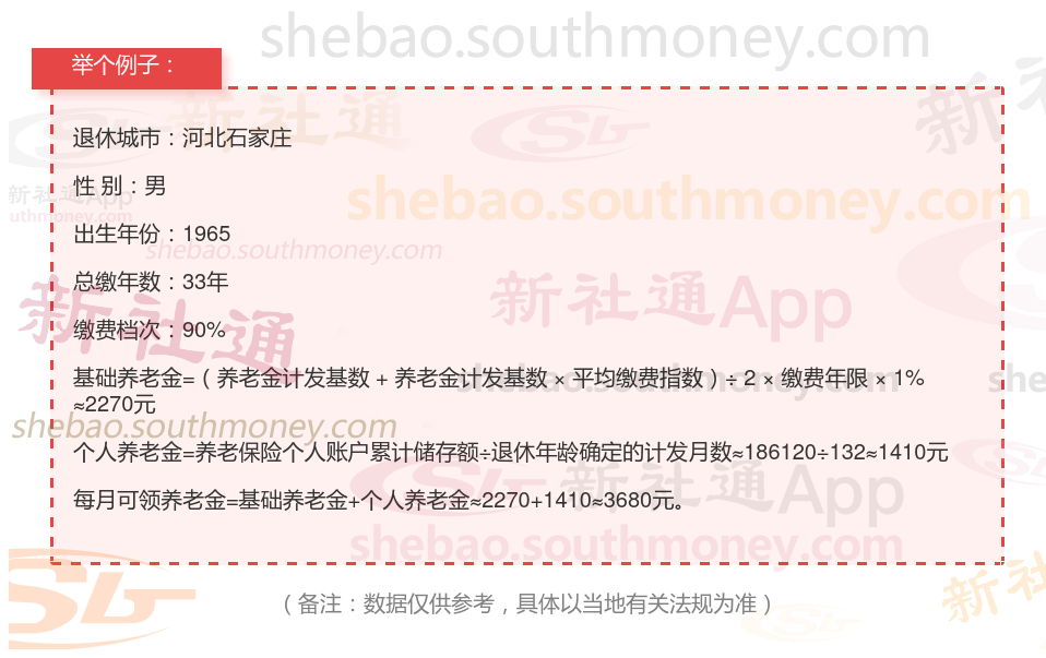 退休城市:河北石家庄,性别:男,出生年份:1965,总缴年数33年,缴费档次:90%,新社通app养老金计算器所得: