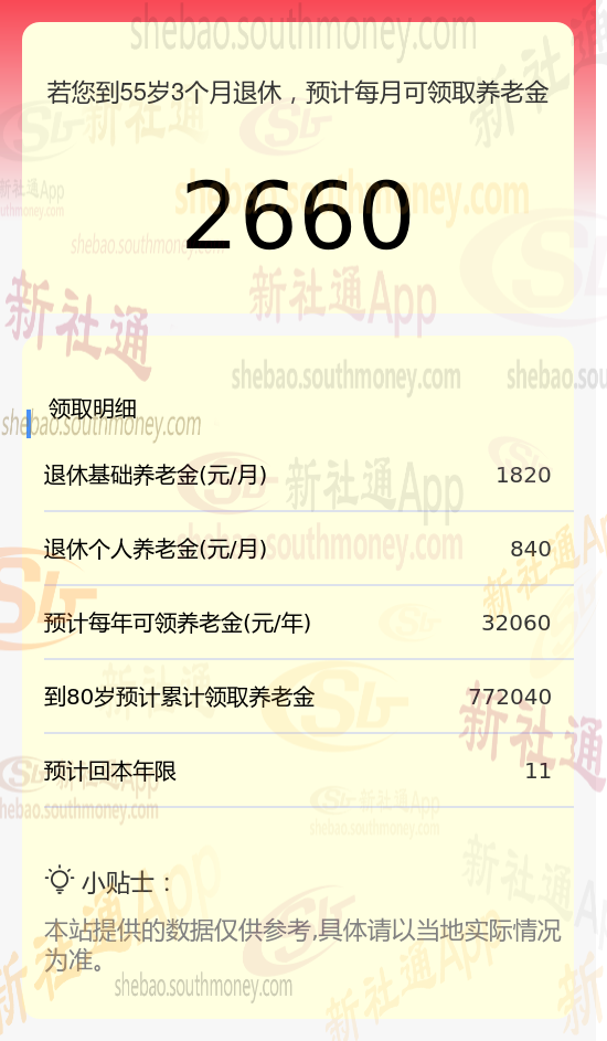 新社通app养老金计算器计算所得:
