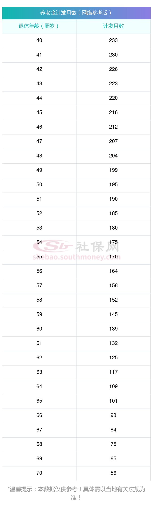 计发月数根据退休年龄和当时的人口平均寿命来确定,具体数值可在相关表格中查找。