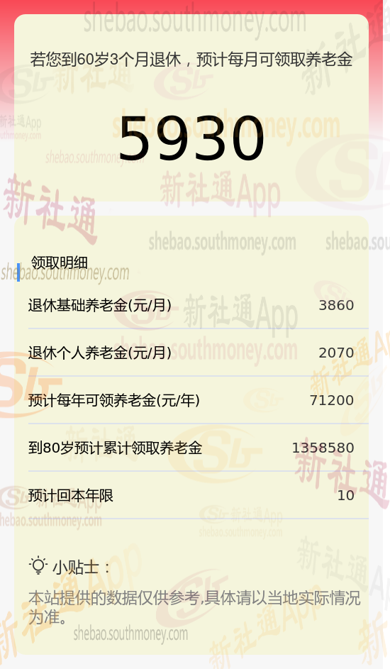 因此,王某预计每月可领取的养老金总额为基础养老金与个人养老金之和,即3860元 +2070元 = 5930元。这一估算结果由新社通app养老金计算器提供。