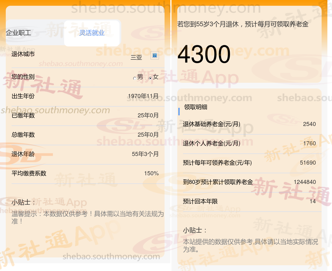 退休城市:海南三亚,性别:女,出生年份:1970,总缴年数25年,缴费档次:150%,新社通app养老金计算器所得:
