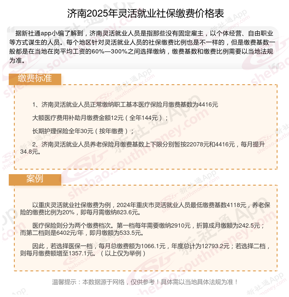 据新社通app数据显示,济南灵活就业养老保险的缴费基数为:4416元。灵活就业人员参保缴费的比例为个人20%。