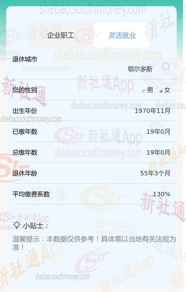 近期,有一位来自内蒙古鄂尔多斯的已退休女性,灵活就业社保人员通过后台询问,即将步入退休了,累计工作年限为19年。每月按照130%档位缴纳。她想知道,基于这些信息,她养老金能领多少?并且是否能够达到2600元。