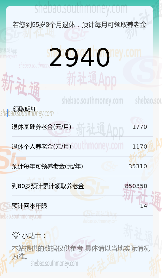 每月可领养老金总额:将基础养老金与个人养老金相加,每月可领取的养老金总额约为2940元(1770元+1170元)。