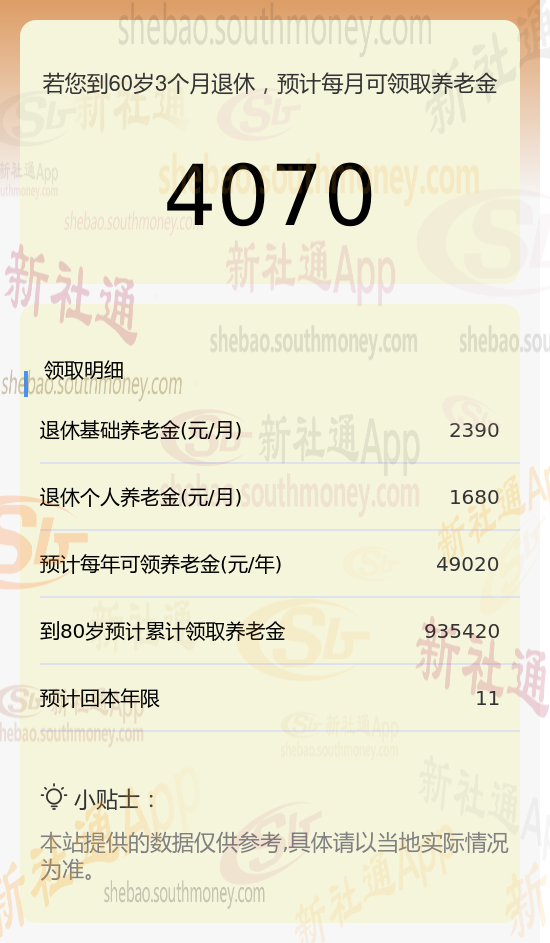 现在,我们来计算一下每月可领取的养老金总额。只需将基础养老金的2390元与个人养老金的1680元相加,得到的总数就是每月可以领取的养老金,大约是4070元。这个数字象征着您退休后每月可以期待的一笔稳定收入。