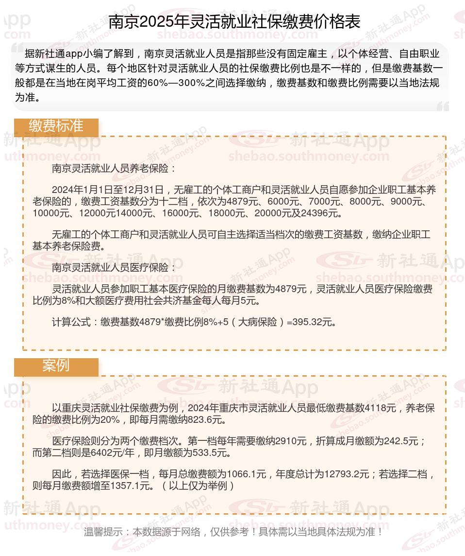 据新社通app数据显示,南京企业灵活就业养老保险的缴费基数为:4494元。