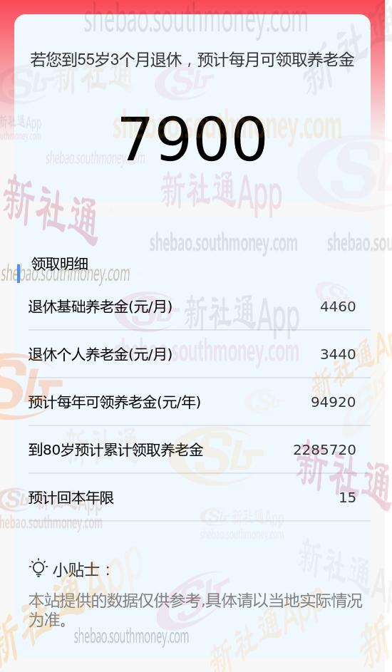 每月可领养老金总额:将基础养老金与个人养老金相加,每月可领取的养老金总额约为7900元(4460元+3440元)。