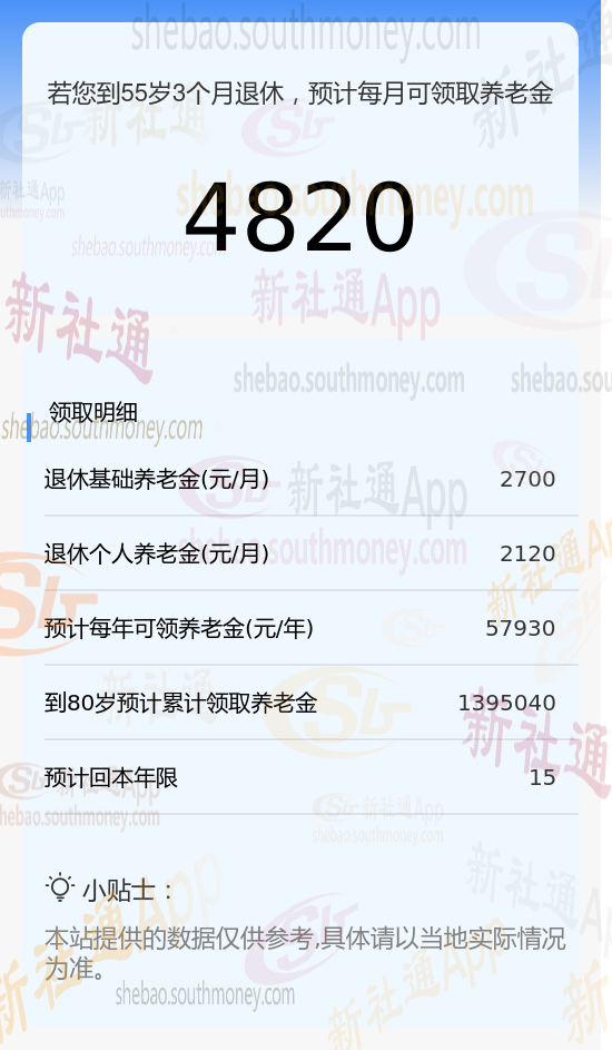新社通app养老金计算器计算所得: