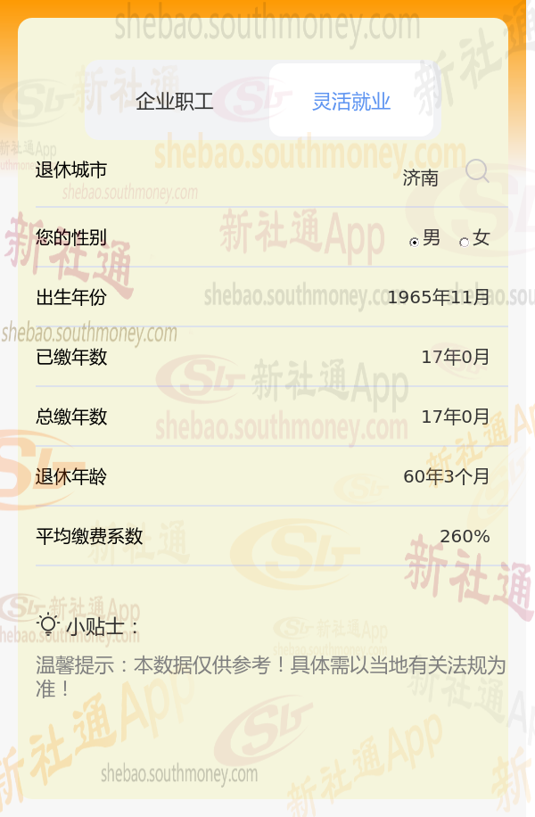 社保按260%档次缴费的希某,济南城市退休,出生于1965年,工龄17年,男性。岁月流转,他终于迎来了自己的退休年龄。