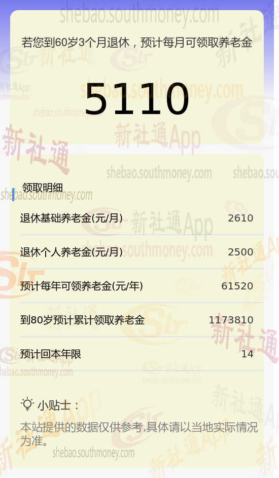 养老金总和:两者合计2610元+2500元,您每月的养老金总额为5110元。