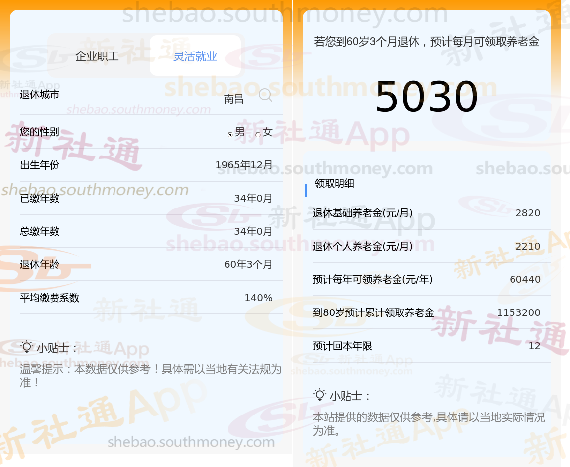 柯某,作为一位勤勉的职工,他的养老保险缴纳记录长达34年之久,且缴费档次一直保持在较高的140%水平。基于这些关键数据,我们利用新社通app养老金计算器,结合最新的养老保险法规,对其养老金进行了如下估算: