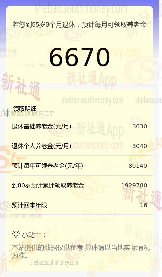 总养老金月度领取额:将基础养老金和个人养老金相加,得出每月可领取的养老金总额大约为6670元(即3630元基础养老金+3040元个人养老金)。