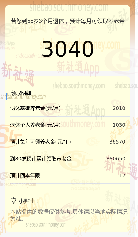 新社通app养老金计算器所得出,每月领取3040元养老金。