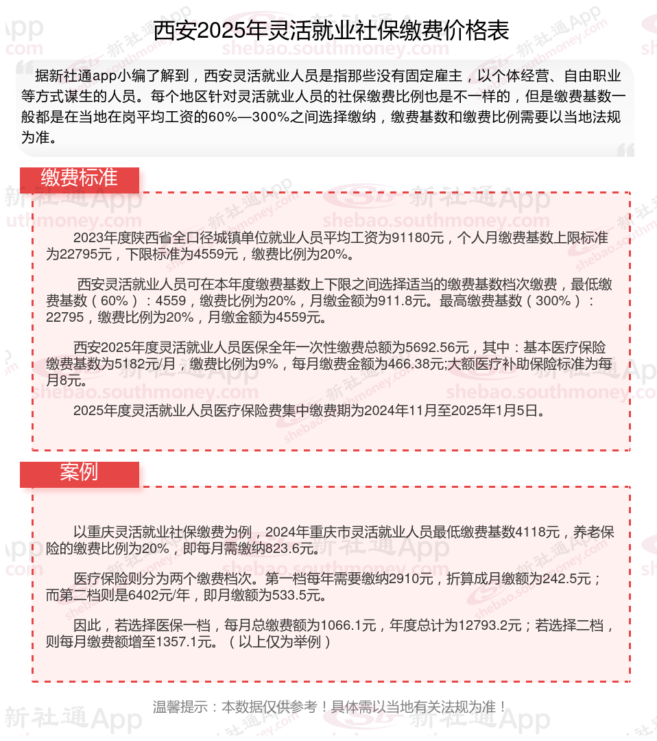据新社通app数据显示,西安灵活就业养老保险缴费基数2024-2025年最新标准如下: