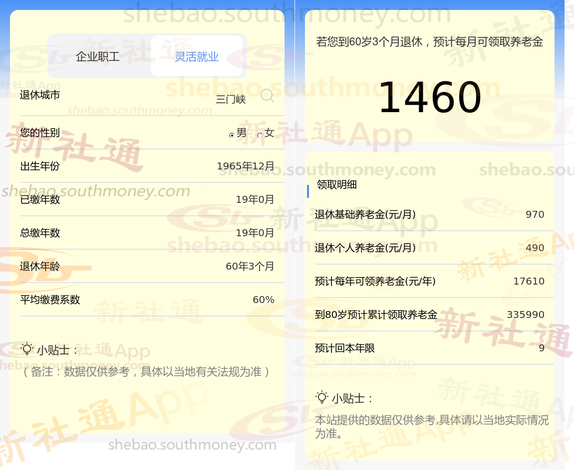 退休城市:三门峡,性别:男,出生年份:1965,总缴年数19年,缴费档次:60%,新社通app养老金计算器所得: