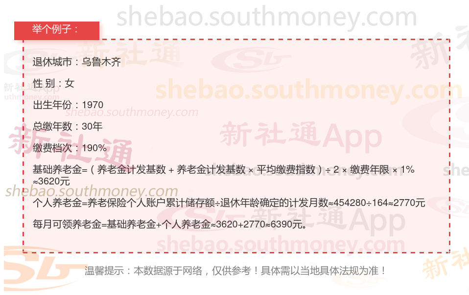 退休城市:乌鲁木齐,性别:女,出生年份:1970,总缴年数30年,缴费档次:190%,新社通app养老金计算器所得: