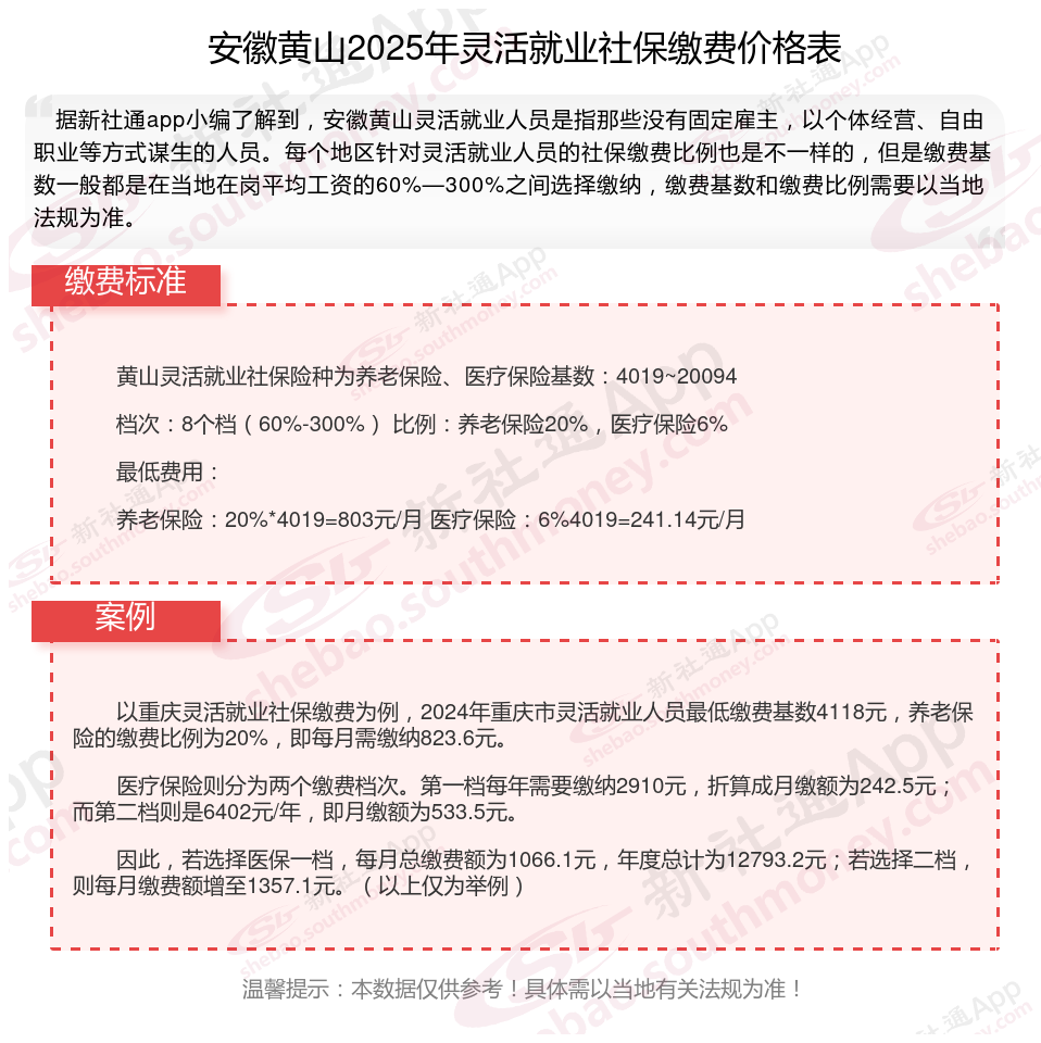 据新社通app数据显示,安徽黄山灵活就业养老保险缴费基数2024-2025年最新标准如下:
