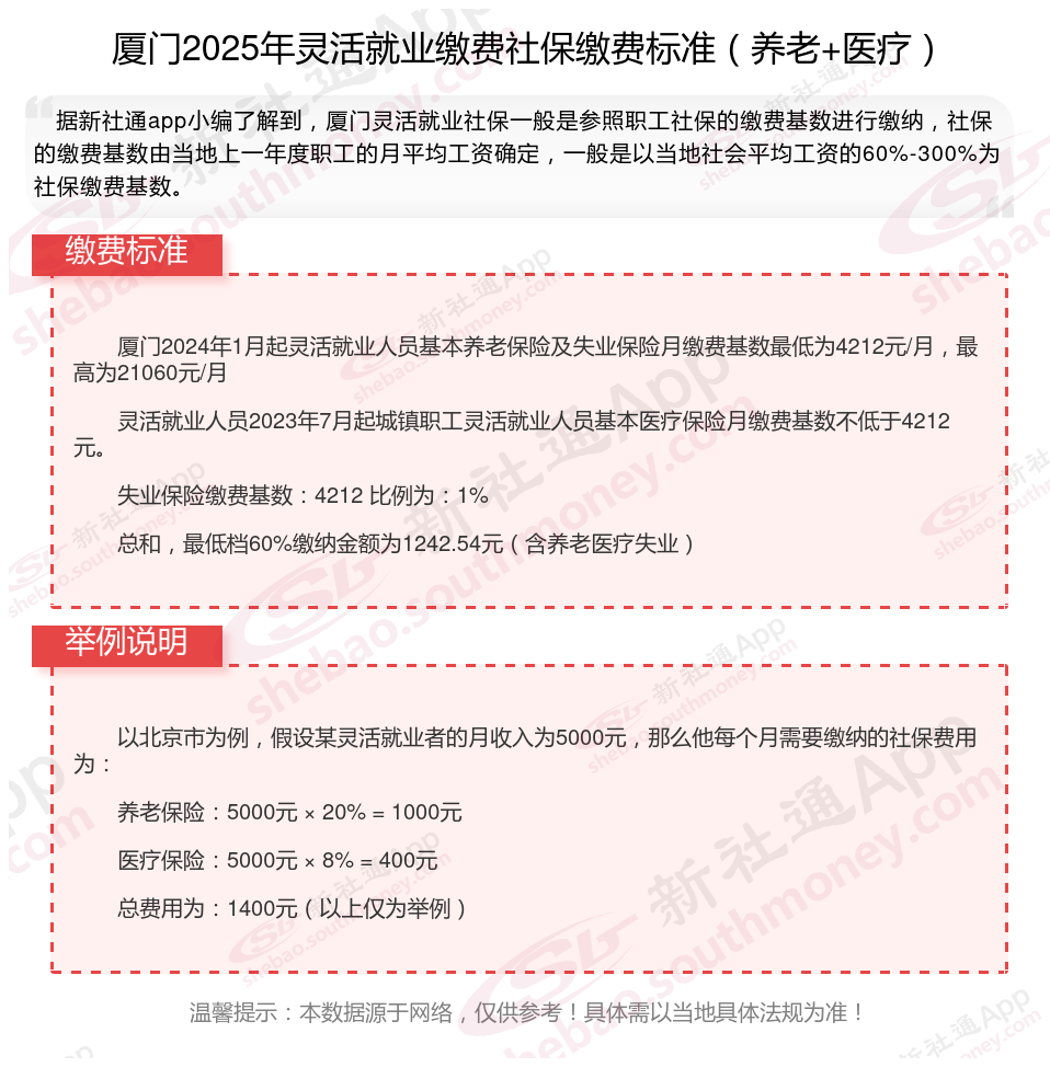 据新社通app数据显示,厦门灵活就业养老保险最低缴费基数为:4212元;个人的缴费比例分别为:20%;