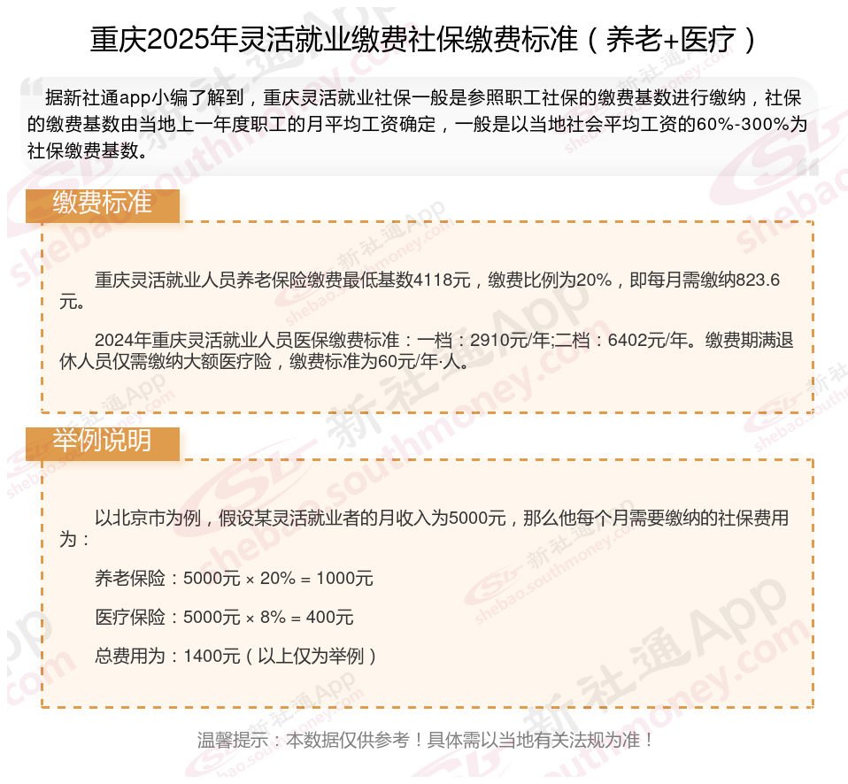 据新社通app数据显示,重庆灵活就业人员养老保险缴费基数2024-2025年最新标准如下:
